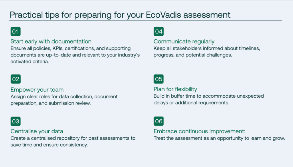 Starting early has been a game-changer for us. A couple of years ago, we began preparing a few weeks before the assessment deadline. Now, we start at least four months in advance to review policies, KPIs, and documentation thoroughly. This extended timeline allows us to ensure that everything is updated and aligned with EcoVadis’ requirements.