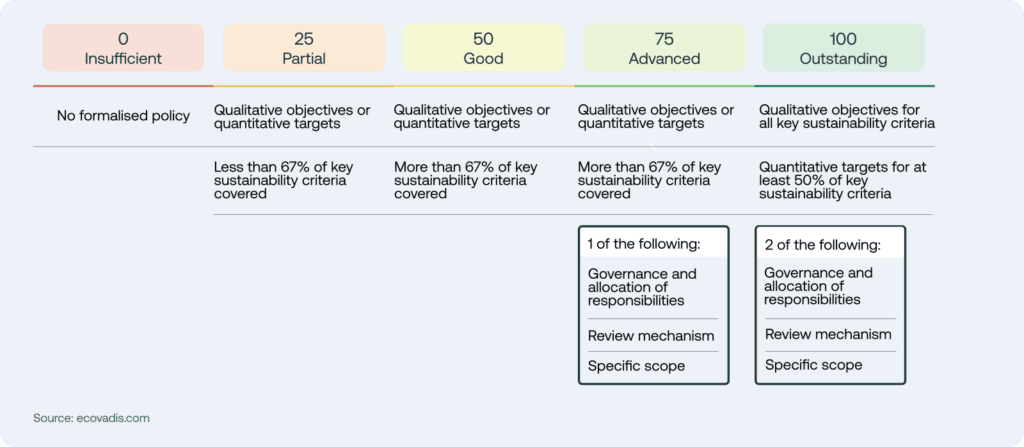 EcoVadis uses a scoring system that evaluates the comprehensiveness of a company’s sustainability policies. To score well, companies need to cover a significant portion of the key sustainability criteria identified for their specific industry.
