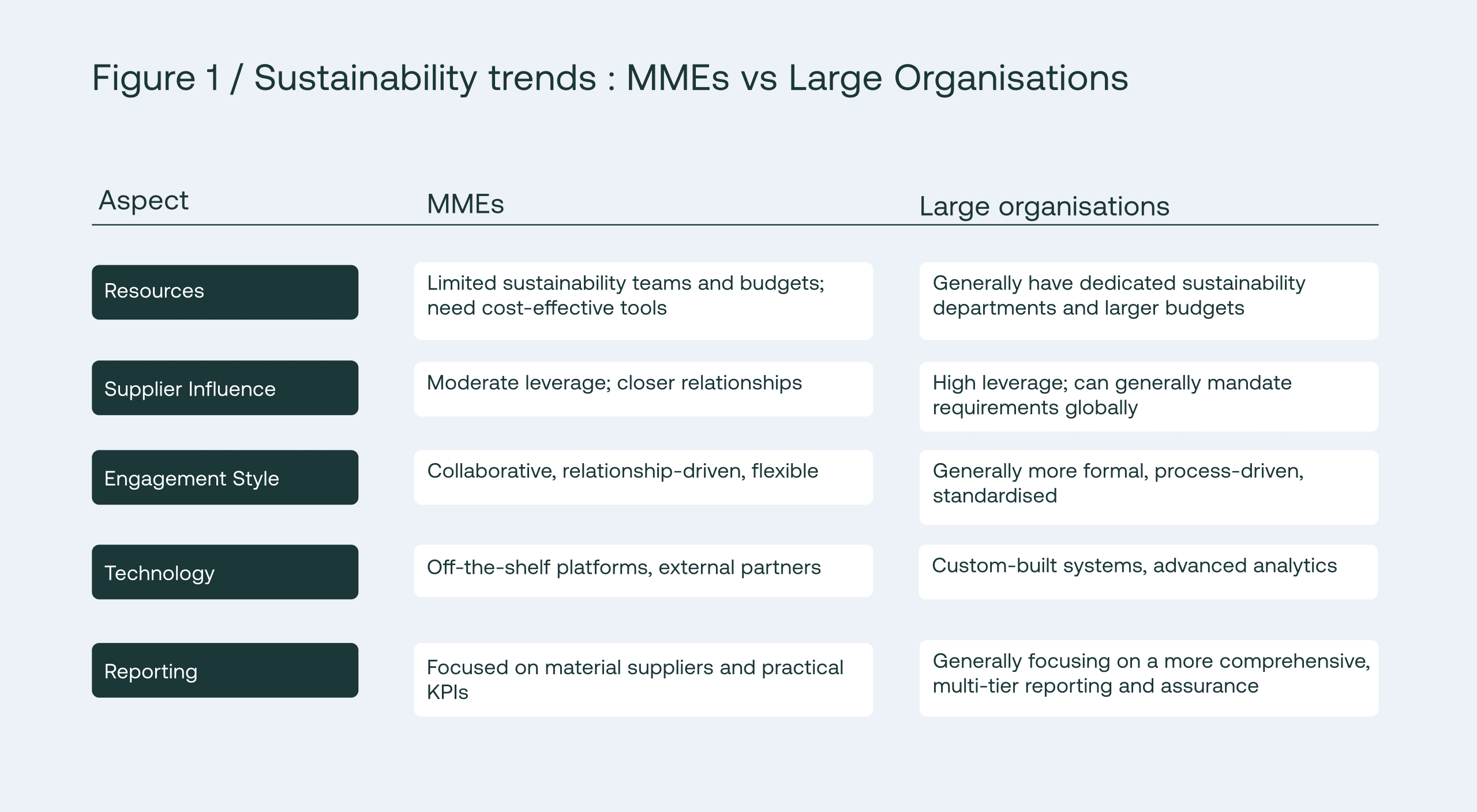 MMEs (100–500 employees in the EU; 500–1,500 in the US) are large enough to influence their supply chains but often lack the scale or resources of multinational corporations. They can drive significant change by leveraging purchasing power and strategic relationships, but must do so efficiently. Large organisations, on the other hand, have the resources and scale to implement comprehensive supplier engagement programmes, but often face complexity and slower adaptability due to their size. As regulators and stakeholders demand more transparency, both MMEs and large organisations must step up their efforts-albeit with different approaches.