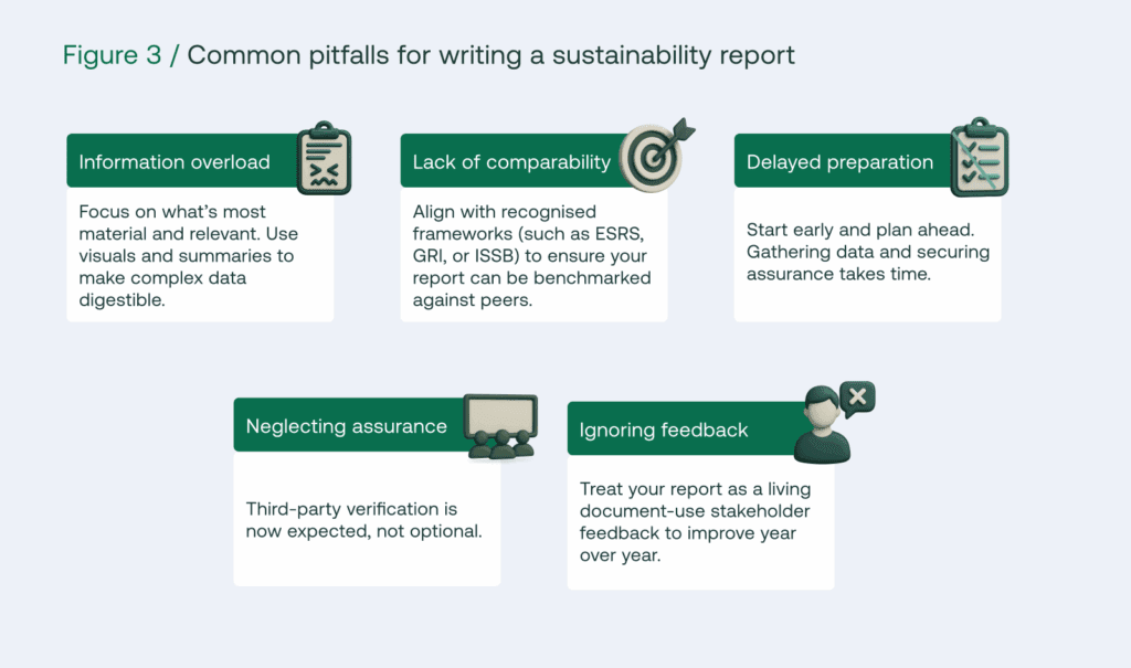 Be transparent about your methodologies, data sources, and any limitations. Stakeholders are increasingly wary of greenwashing, making it essential to acknowledge both successes and areas where improvement is needed.
