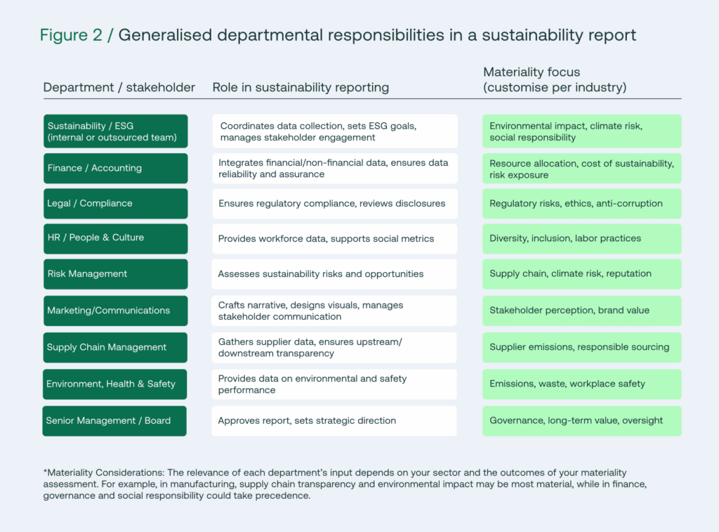 Effective sustainability reporting relies on cross-functional collaboration, with each department playing a distinct role in contributing data, insights, and oversight across key ESG dimensions. Here is what that looks like: