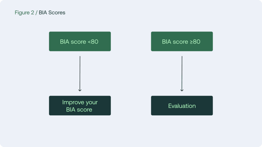 Upon completion of the questionnaire and submission of the supporting documentation, you will receive an initial BIA score. If you have achieved a BIA score of 80 or above, and nothing is flagged on your disclosure questionnaire, you will proceed to the next stage of the process: evaluation. However, if your score is below 80, you will need to make adjustments before your assessment can be evaluated for B Corp certification.